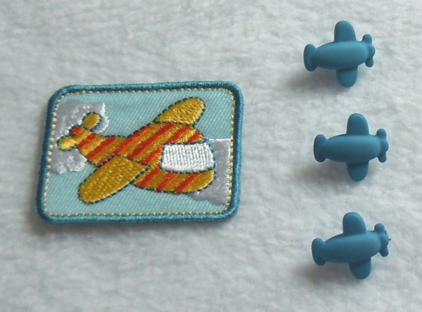 enthalten ist ein Bügelmotiv "Flugzeug" (4,5 x 3,5 cm groß) und 3 Flugzeug-Knöpfe in der Farbe ihrer Wahl
