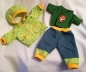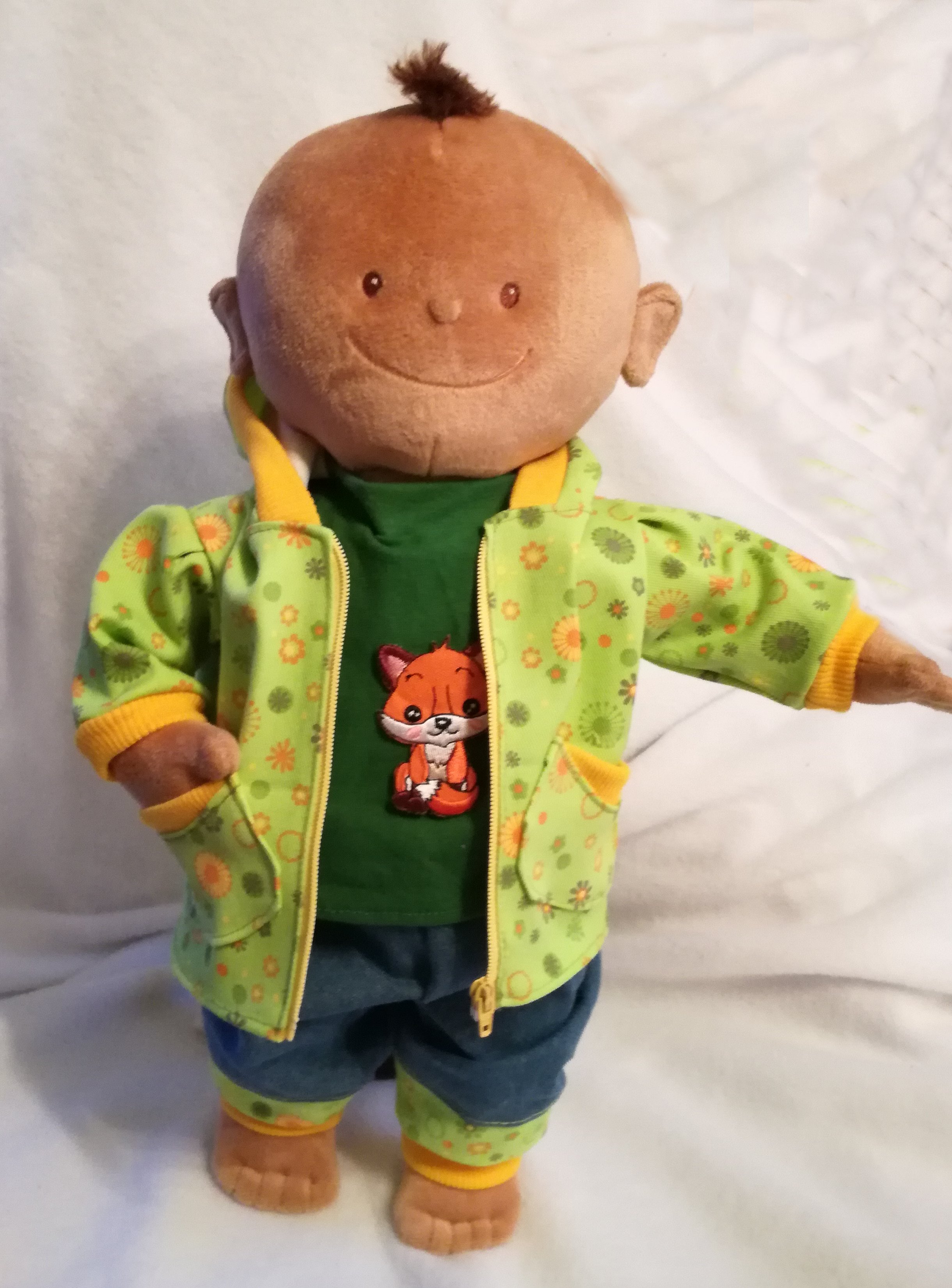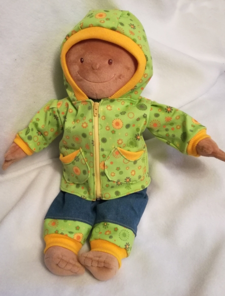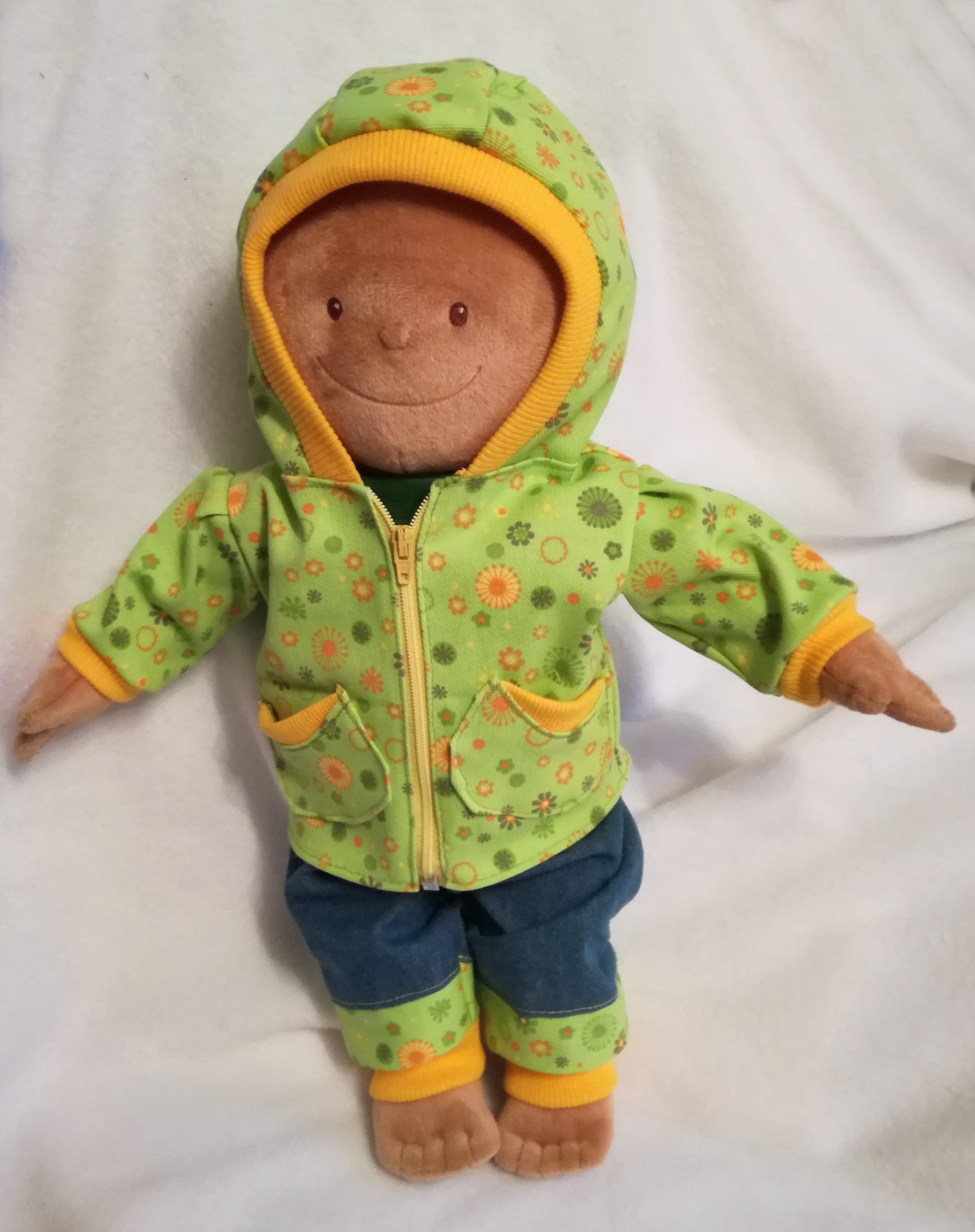 Genäht wird hier eine Kapuzenjacke mit Reißverschluss, Bündchen an Kapuze und Ärmeln, dazu passend eine Jeans mit Bündchen am Bund und den Beinen und ein Kurzarm-Shirt.