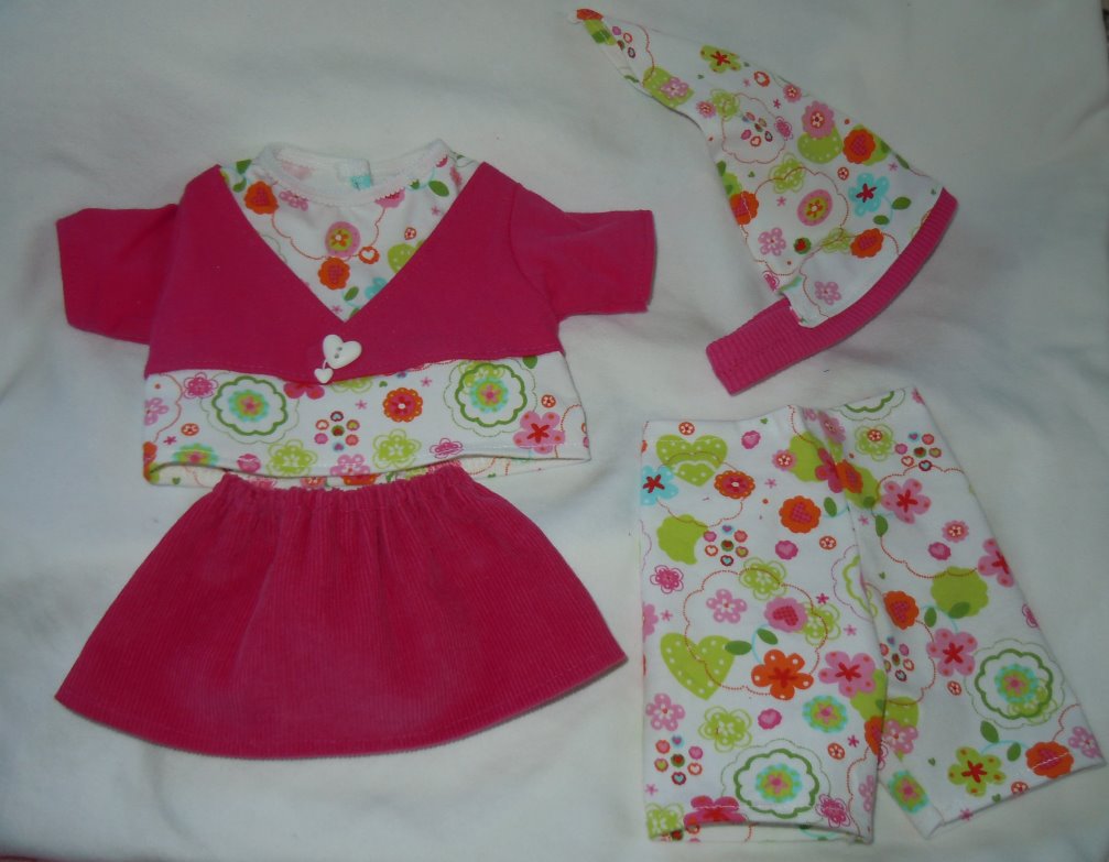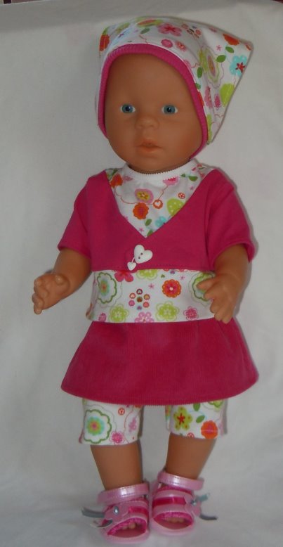 Radlerhose und Shirt mit Westchen aus elastischem Jersey weißgrundig mit tollem Blumenmuster, dazu ein Kopftuch mit Stirnband.